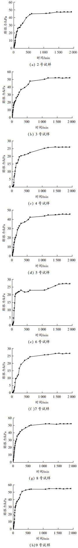 采用“应力平衡法”对1~9号试样进行膨胀力测试。试验过程中记录膨胀力随时间的变化情况,绘制膨胀力—时间关系曲线,如 图 10所示。由于1号试样在试验周期内无明显膨胀现象,因此未得出膨胀力测试结果。
