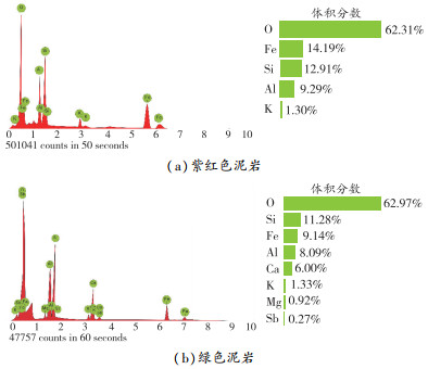 通过XRD分析可知,褐色、紫红色等泥岩中赤铁矿、针铁矿占比较高,初步分析其Fe元素含量对泥岩颜色有一定影响。分别选取紫红色和绿色泥岩试样,分析其元素组成,测试结果如 图 11所示。
