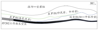 照金煤矿ZF202工作面发生严重的顶板泥砂溃涌事故,采煤工作面顶板大量泥砂、碎石和水混合物迅速溃入井下,溃入泥砂物质总量2 291.65 m 3,在我国深埋煤层开采中极为罕见。事故发生后地面探查结果表明,煤层顶板部分区域延安组地层缺失,在直罗组底部发育有厚度30 m左右的杂色泥岩,为事故发生的主要溃入泥砂来源,如 图 2和 图 3所示。
