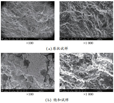 由于砂岩粒径较大,故选取放大倍数为100和1 000,泥岩试样选取放大倍数100和2 000,观测对比试样原状和遇水后的结构特征 [ 22] 。各试样扫描电镜结果如 图 6~ 8所示。